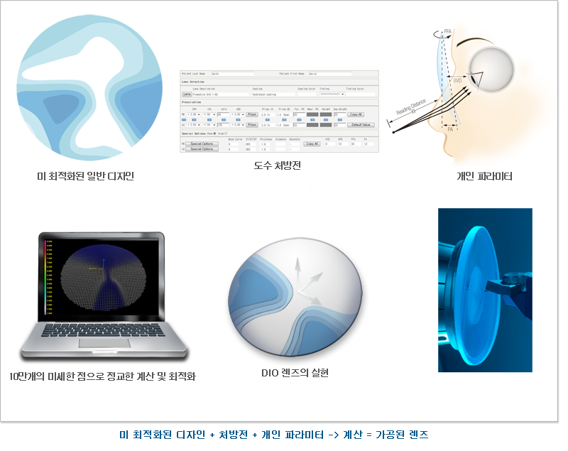 여러분의 렌즈를 제조할 때, DIO는 착용자마다 갖고 있는 렌즈와 관련된 수많은 특징들을 고려하여 종합적으로 분석합니다. 착용자의 처방도수, 신체적 특징, 안경테, 보는 습관, 생활패턴, 사용목적 등이 그것입니다. 개별 맞춤 설계 및 렌즈면 형성 기술은 착용자가 어떠한 착용조건을 갖고 있든지 간에 종합적으로 착용자 개인에게 특화된 렌즈의 설계와 생산을 가능하게 하는 최신 기술입니다.